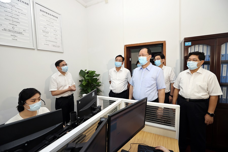 8月10日上午,省委副书记、省长毛伟明来到省乡村振兴局调研。图为毛伟明一行在该局12317信访举报中心考察。