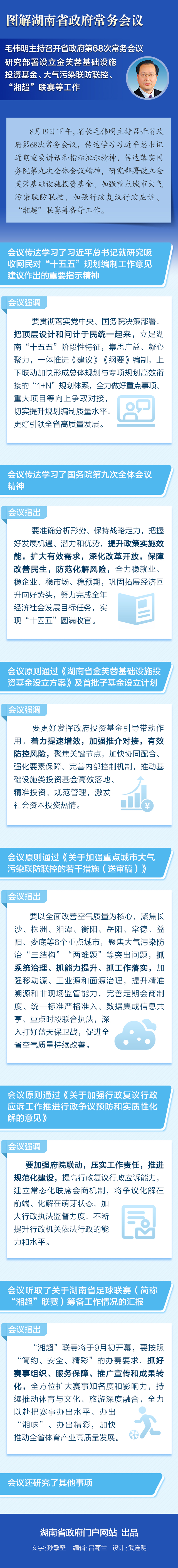 【图解】8月19日省政府常务会议:研究设立金芙蓉基础设施投资基金、大气污染联防联控、“湘超”联赛等