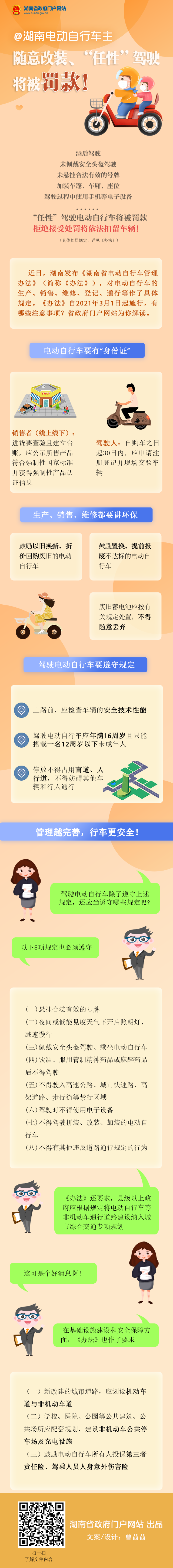 近日,湖南发布《湖南省电动自行车管理办法》(以下简称《办法》),对电动自行车的生产、销售、维修、登记、通行等作了具体规定。《办法》自2021年3月1日起施行,有哪些注意事项?省政府门户网站为你解读。