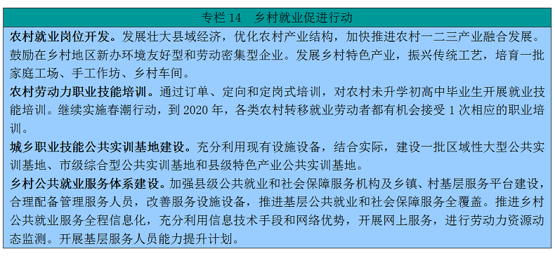 149.提升就业公共服务水平。落实就业政策法规咨询、信息发布、职业指导、职业介绍等公共就业服务制度。大力开展“311”就业服务行动,每年至少为有就业意愿且未就业的农村劳动力推荐3次岗位、提供1次职业指导、提供1次技能培训服务。加快公共就业服务信息化建设,打造线上线下一体化服务体系。整合企业、职业院校和各类培训机构资源,合理布局建设一批公共实训基地。加强就业困难农村劳动力分类帮扶,实施农村残疾人“阳光增收计划”。每年新增农村劳动力转移就业60万人(含农村大学生就业)。
