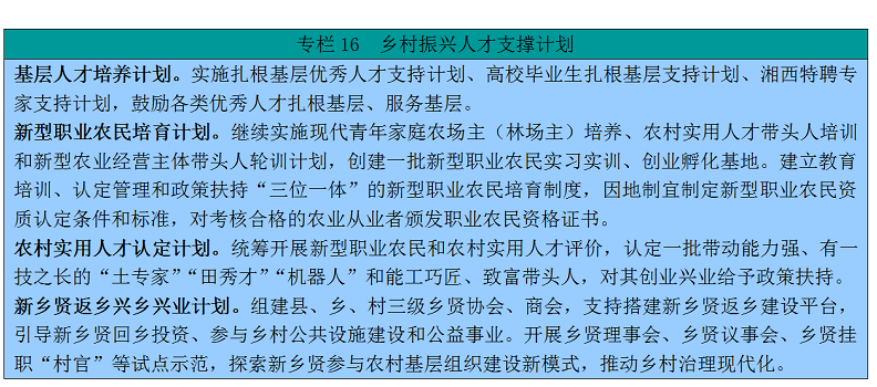 实行更加积极、更加开放、更加有效的人才政策,落实芙蓉人才行动计划,鼓励和引导各类人才投身乡村建设,推动乡村人才振兴,充分发挥好人才在乡村振兴中的支撑作用。