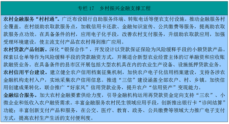 187.完善金融支农组织体系。鼓励各类金融机构到县和乡镇设立分支机构。加大农业银行、邮政储蓄银行对乡村振兴的支持力度。发挥国家开发银行、农业发展银行支持乡村振兴的职责作用,加大长期政策性信贷支持。保持农村商业银行县域法人地位和数量总体稳定,加快农村信用社省联社改革。完善村镇银行准入条件,鼓励包括企业法人、自然人等各类社会资本参与村镇银行的发起设立和增资扩股,实现村镇银行县域全覆盖。
