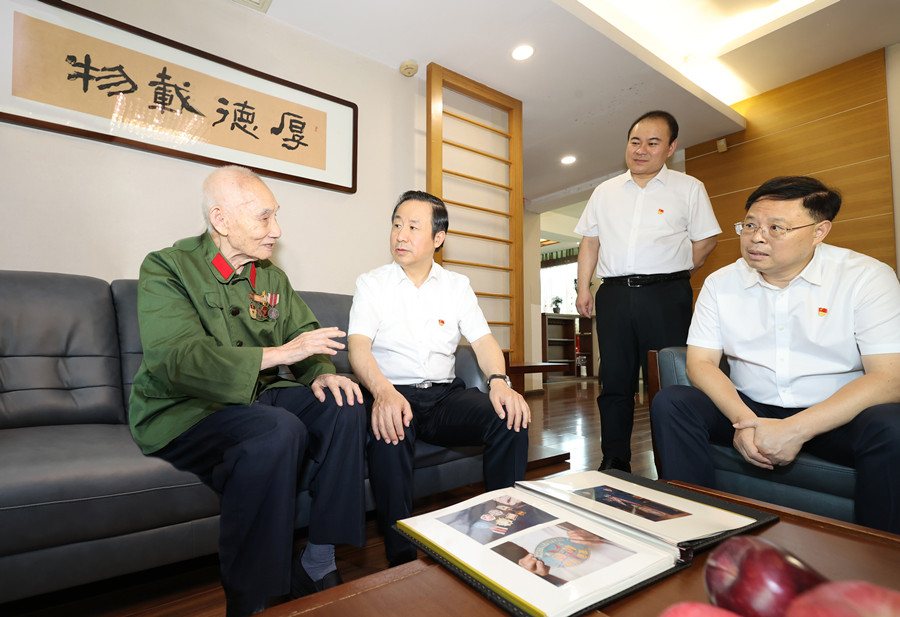 来到蒸湘区,许达哲走进93岁的老党员、老战士文修潮家中,为他佩戴上“光荣在党50年”纪念章,向他转达党中央的亲切关怀,代表省委送上慰问和祝福。许达哲还与文老一起翻阅老照片,倾听老人讲述在抗美援朝战争中英勇作战、数次立功的光辉事迹,关切询问老人的身体状况,并嘱咐当地工作人员照顾好老人的生活。许达哲说,中国共产党百年华诞即将到来,要大力宣传老党员、老战士的感人故事,引导大家学习他们的革命精神和崇高品质,为实施“三高四新”战略、建设现代化新湖南凝聚强大精神力量。