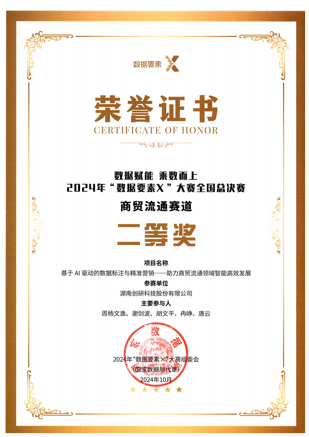 湖南创研科技股份有限公司《基于归因算法的数据标注与精准营销 助力商贸流通领域智能发展》获“数据要素x”商贸流通赛道二等奖。
