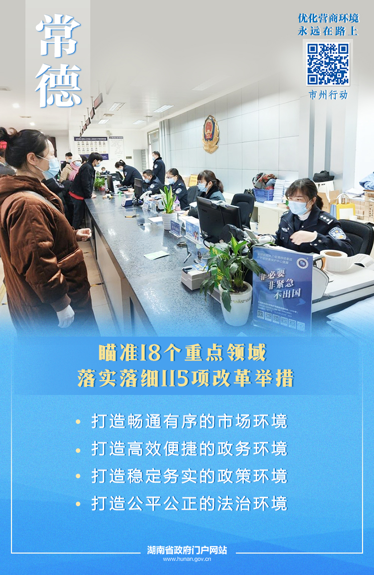 5月12日,常德发布《常德市优化营商环境2022版》,聚焦市场主体和人民群众“全生命周期”,在18个重点领域持续实施优化营商环境系统集成改革,推动115项改革举措落实落细,着力打造市场化、法治化、国际化营商环境。