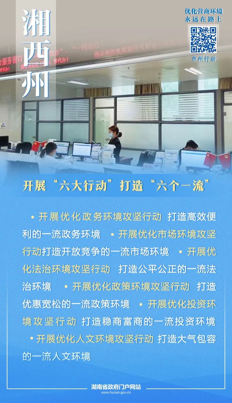 近日,为贯彻落实全省优化营商环境推进会精神,湘西土家族苗族自治州立即制定推进措施,围绕开展“六大行动”、打造“六个一流”的高招思路,全面打响了优化营商环境攻坚战。