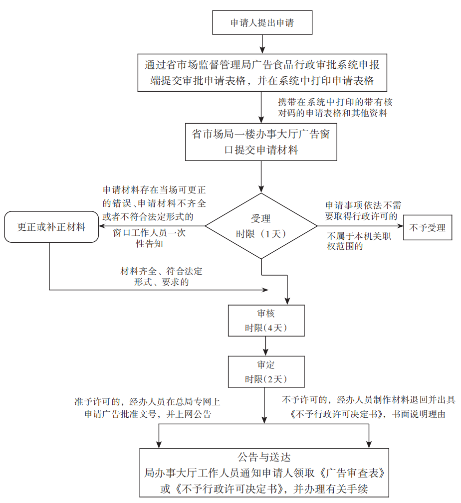 申请人通过省市场监督管理局广告食品行政审批系统申报端提交审批申请表格,并在系统中打印申请表格,携带在系统中打印的带有核对码的申请表格和其他资料,前往湖南省市场监督管理局政务服务大厅现场办理。