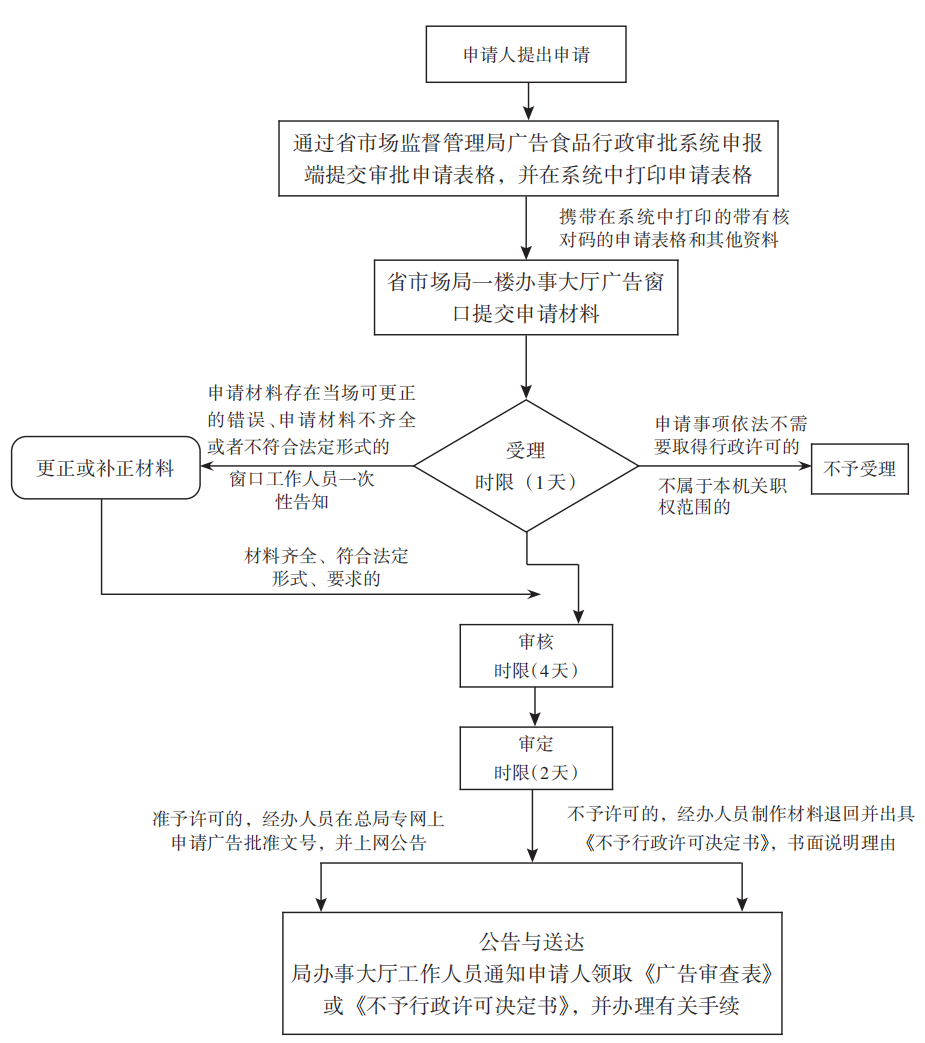 申请人通过省市场监督管理局广告食品行政审批系统申报端提交审批申请表格,并在系统中打印申请表格,携带在系统中打印的带有核对码的申请表格和其他资料,前往湖南省市场监督管理局政务服务大厅现场办理。