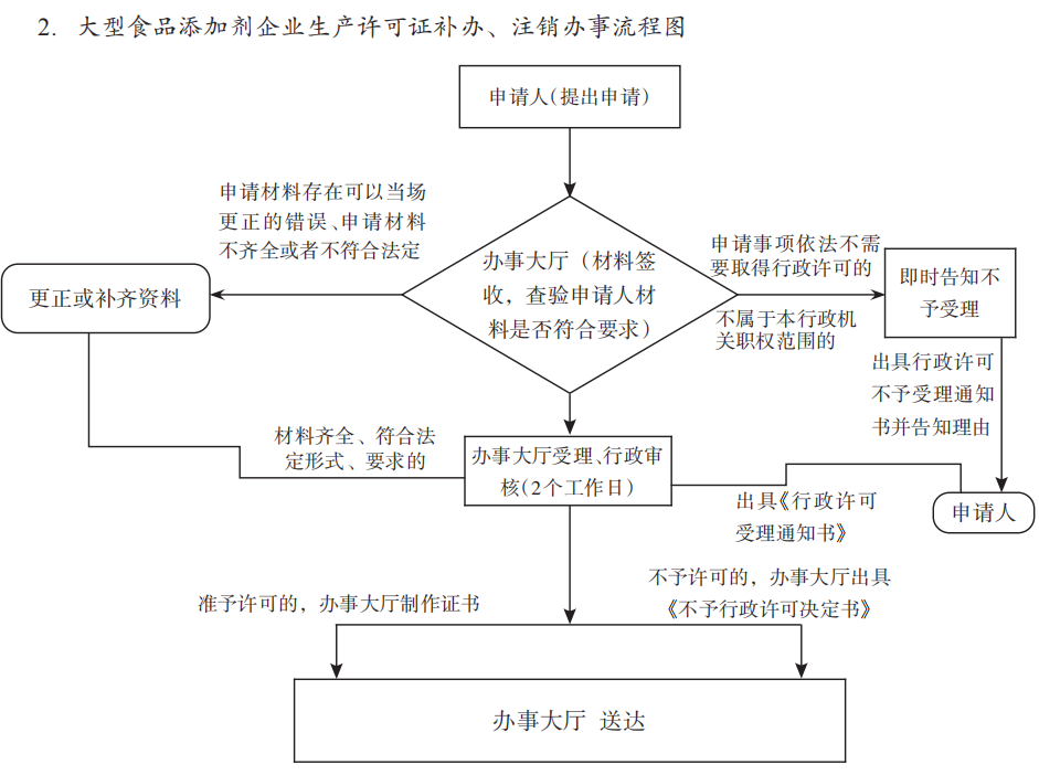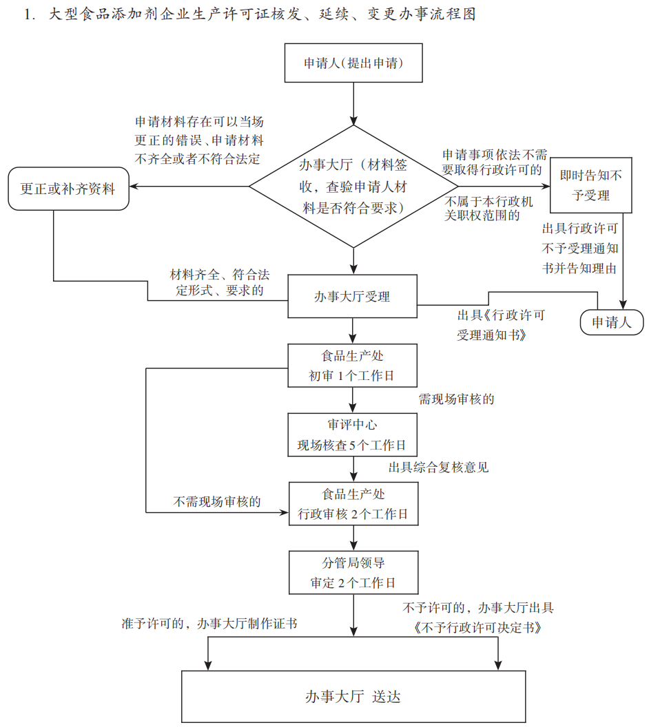 自受理之日起,办理大型食品添加剂企业生产许可证核发、延续、变更事项 10 个工作日, 补办、注销事项2个工作日做出行政许可决定 (不包括材料补正、补充、许可中止、公告时间),因特殊情况需要延长期限的,经本级行政机关负责人批准,可以延长5个工作日。