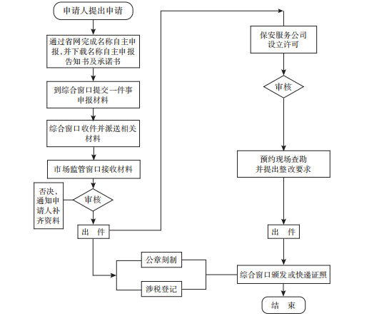 营业执照2 个工作日,保安服务公司设立许可18 个工作日,税务事项办理可即时办结。不符合相关情形,或涉及增值税专用发票 (增值税税控系统) 最高开票限额审批且最高开票限额十万元以上的最多需要20 个工作日。