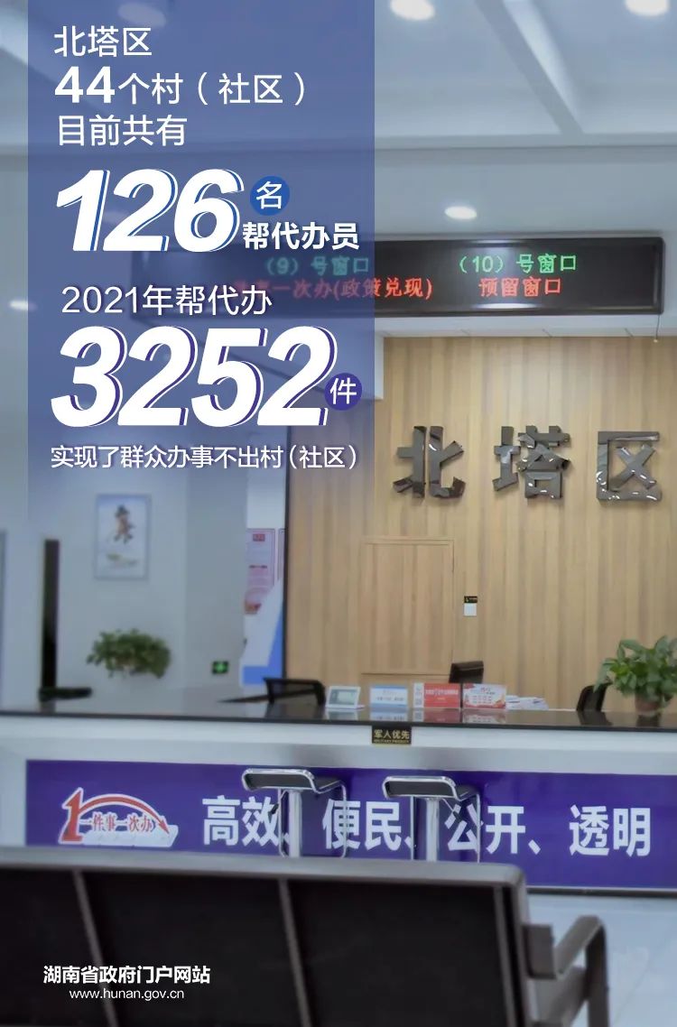 据邵阳市行政审批局工作人员介绍,北塔区44个村(社区)目前共有126名帮代办员。2021年帮代办3252件,实现了群众办事不出村(社区)。