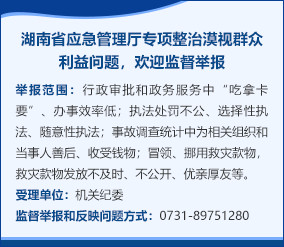举报范围:行政审批和政务服务中“吃拿卡要”、办事效率低;执法处罚不公、选择性执法、随意性执法;事故调查统计中为相关组织和当事人善后、收受钱物;冒领、挪用救灾款物,救灾款物发放不及时、不公开、优亲厚友等;形式主义、官僚主义,铺张浪费、贪图享乐、以权谋私等作风问题。监督举报和反映问题方式:0731-89751280;来信请寄长沙市雨花区马王堆南路80号省应急管理厅机关纪委。