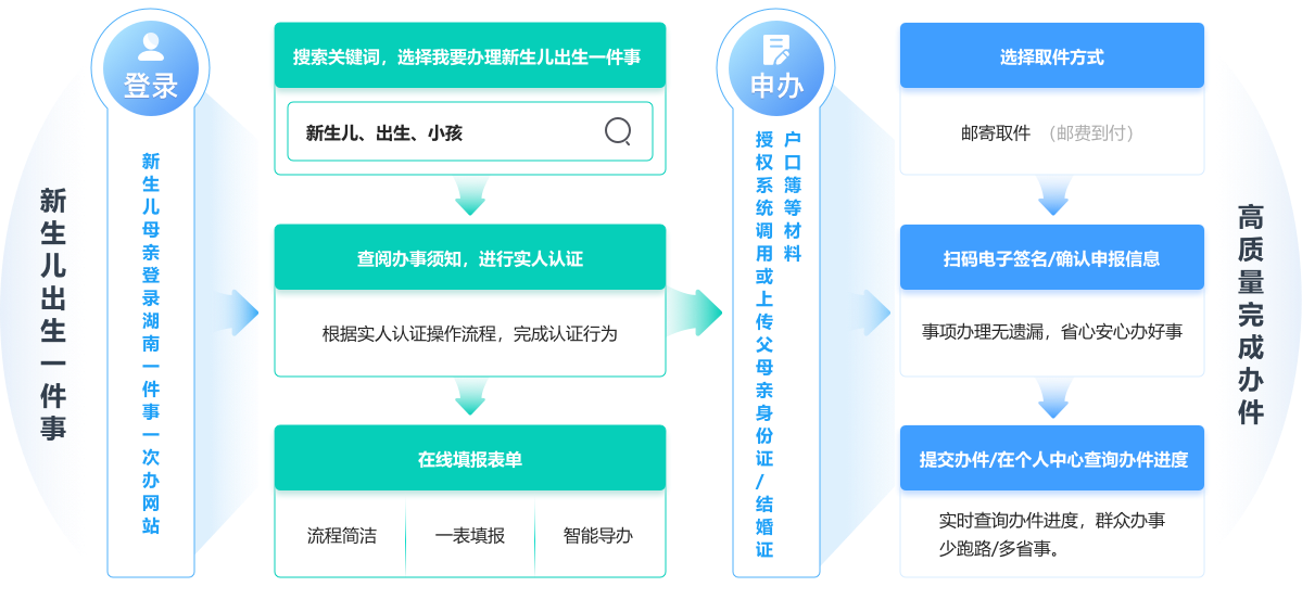 将出生医学证明首次签发、预防接种证办理、出生登记、社会保障卡申领、生育医疗待遇支付 、城乡居民参保登记、科学育儿指导服务登记事项集成为“一件事”,实现"一件事一次办""一网通办"。提供生育登记和生育保险就医登记、门诊产检等费用报销网上申报办理服务。