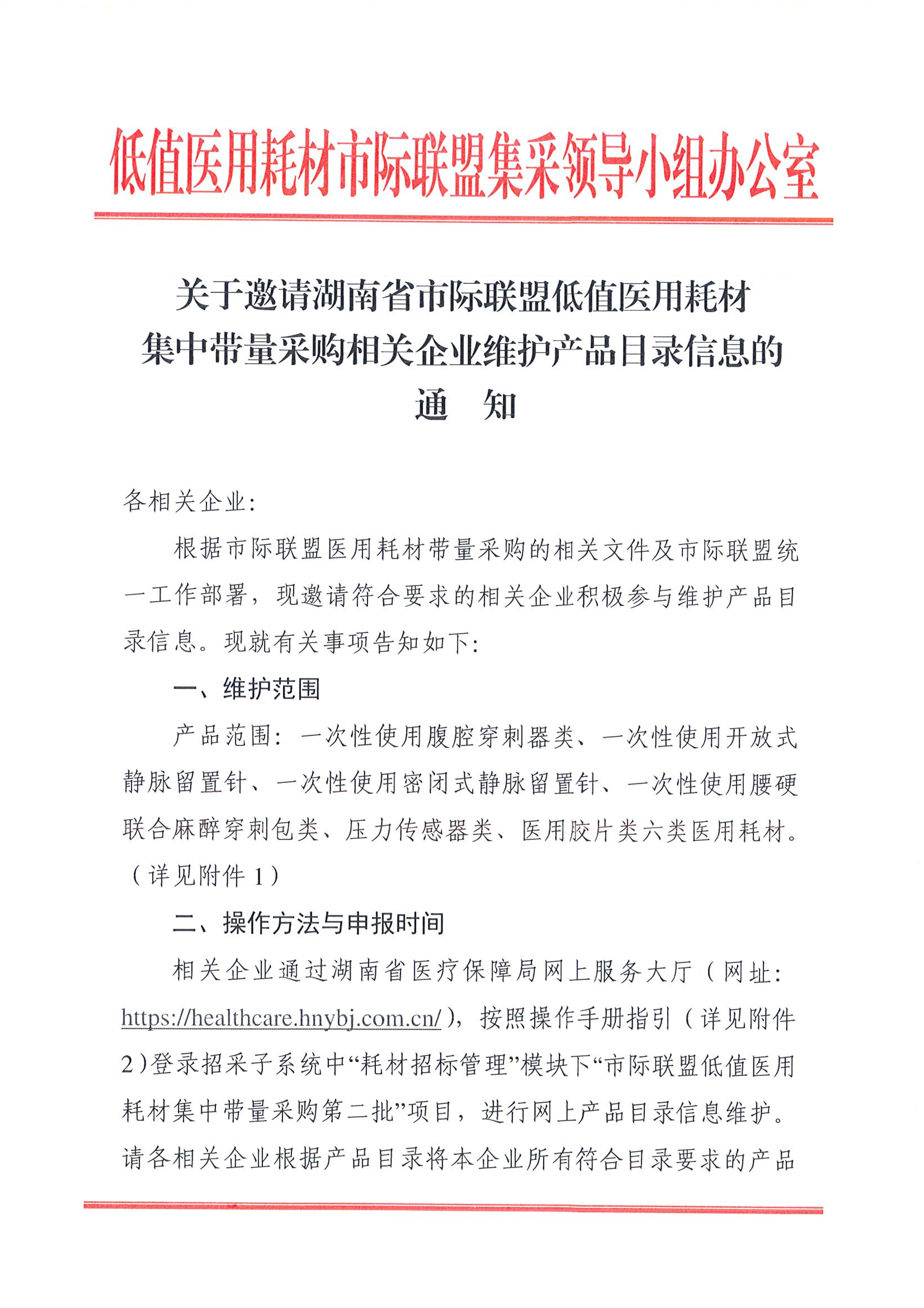 关于邀请湖南省市际联盟低值医用耗材集中带量采购相关企业维护产品目录信息的通知