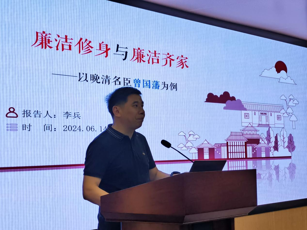 本次讲座邀请了湖南大学教育科学研究院教授、博士、文化学者李兵教授主讲。他以“廉洁修身与廉洁齐家”为主题,以晚清名臣、湖湘家风模范曾国藩为例,从廉洁修身、读书明理、廉洁齐家三大部分,讲述了家庭教育的重要性。