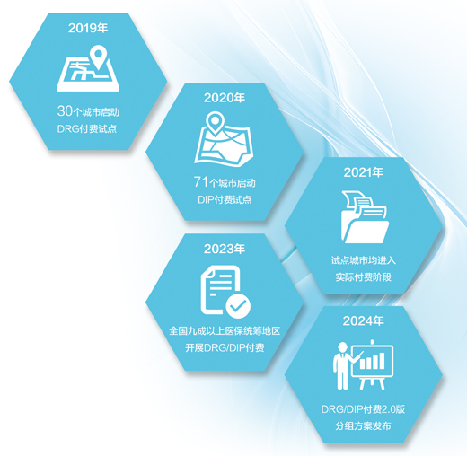2019年,国家医疗保障局在武汉、湘潭等30个城市启动按病组付费试点;次年,在厦门等71个城市启动按病种分值付费试点。2021年,试点城市均进入实际付费阶段。